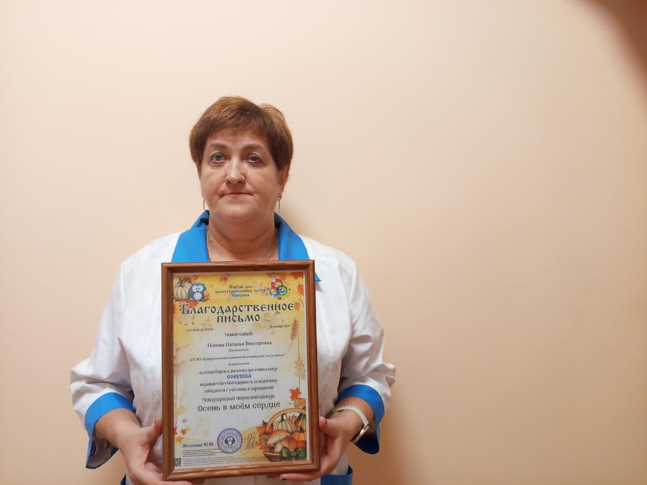 Воспитатель, Попова Н.В., отмечена благодарственным письмом за профессиональную подготовку конкурсанта.