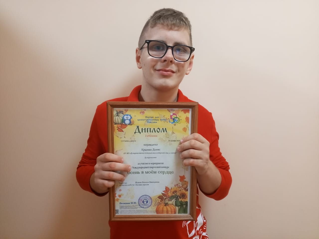 Воспитанник нашего детского дома – интерната, Крынин Денис, стал победителем Международного творческого конкурса «Осень в моём сердце», получив Диплом I степени.