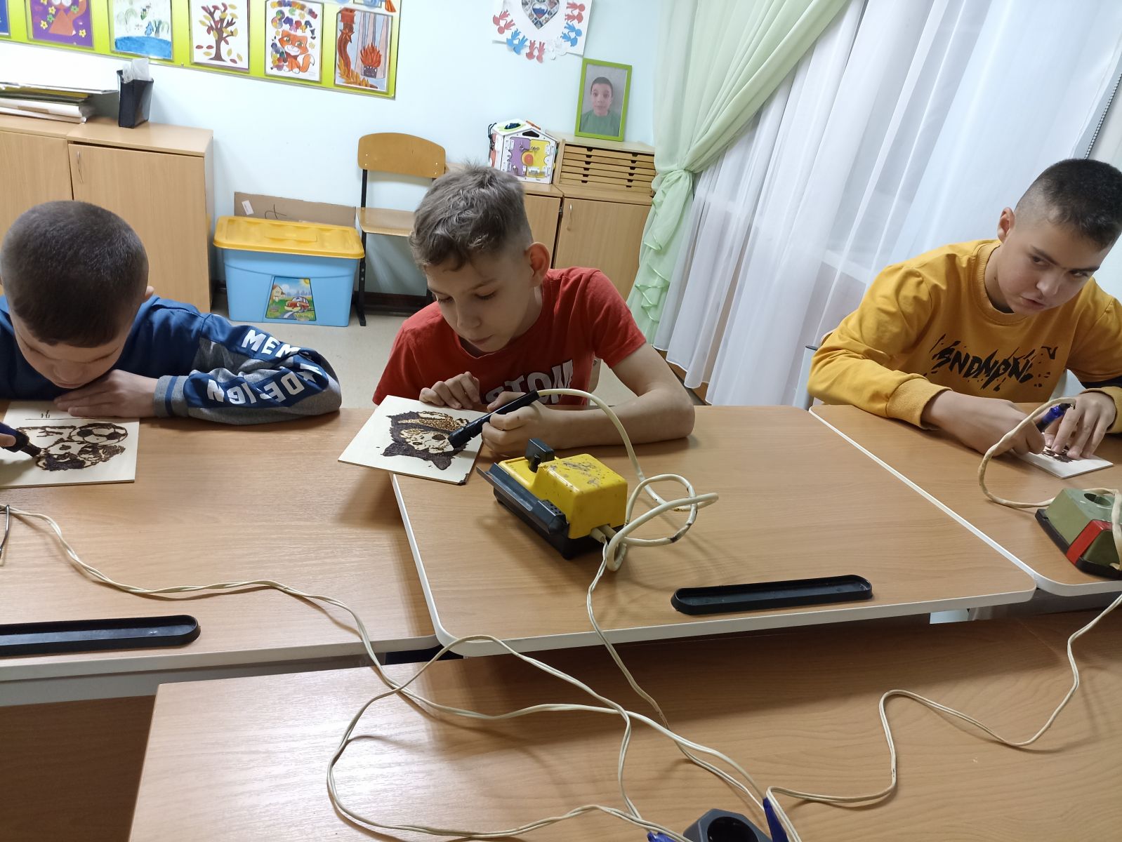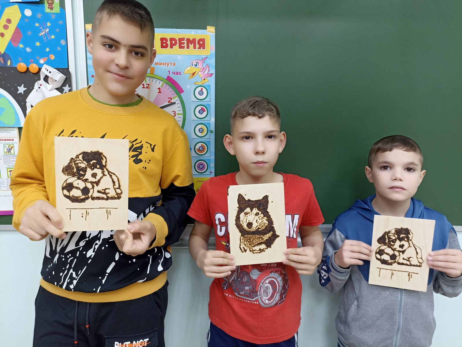 Основная цель занятий — развитие творческих способностей детей через освоение техники пирографии. В рамках программы ребята познакомились с темой «Выжигаем пушистого щенка»». Они с интересом выбирали эскизы для выжигания, слушали тематическую песню «Мой щенок», а затем с воодушевлением приступили к созданию собственных работ.